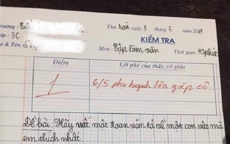 Điều đáng chú ý ở đây là bài văn chân thật này của cậu bé lại làm cho cô giáo bực mình và đã chấm 1 điểm kèm theo lời nhận xét: “Ngày 6/5 phụ huynh lên gặp cô”.