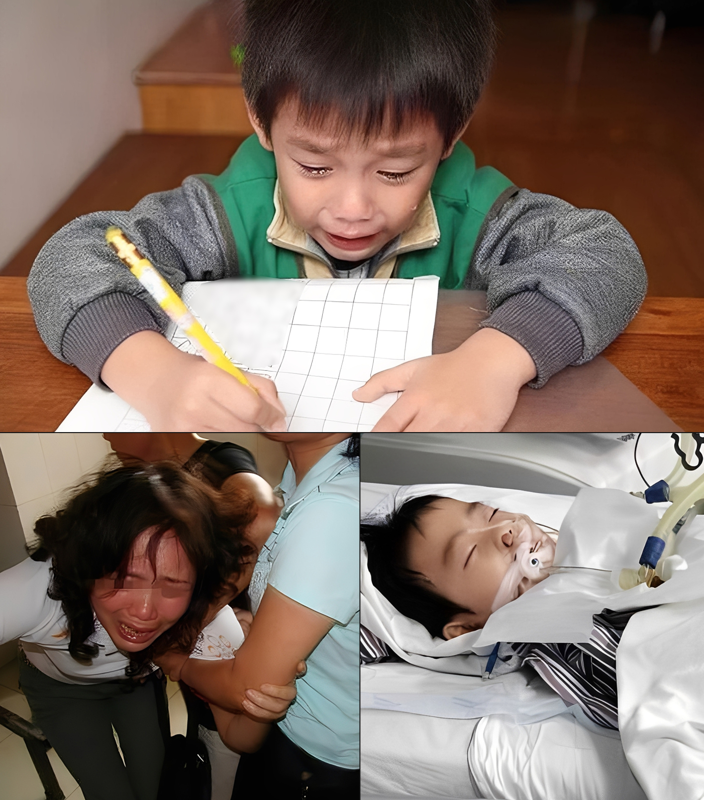 Các bậc cha mẹ hiện đại thường có quan niệm dù nghèo đến đâu cũng cố gắng lo cho con cái học hành tới nơi tới chốn để tương lai của bé sáng lạn, tốt đẹp. Tuy nhiên cũng chính vì nỗi lo tương lai đó mà bố mẹ quên mất hiện tại các con cảm thấy như thế nào. Để rồi khi đánh mất mới chợt nhận ra. Cách đây ít lâu, một cậu bé có tên Tiểu Tiêm (Trung Quốc) bỗng dưng rơi vào trạng thái hôn mê khi đang làm bài tập về nhà. Bố mẹ phát hiện và đưa bé đi cấp cứu. Kết quả kiểm tra cho thấy bé bị suy đa tạng. Trên đường đến bệnh viên, đứa trẻ 9 tuổi có tỉnh dậy 1 lần và nhìn thấy mẹ đang ngồi bên cạnh mình nên liền nói: “Con mệt quá, con ngủ một chút”. Sau đó bé nhanh chóng thiếp đi. Người mẹ cũng không thể ngờ rằng đó là những lời nói cuối cùng mà bản thân nghe được từ con trai.