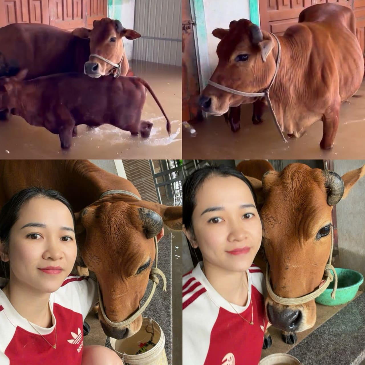 Đêm đó, cả gia đình chị phải di tản tránh lũ, ai nấy đều thấp thỏm không biết hai mẹ con bò có tìm được chỗ an toàn hay không. Đến khoảng 8 giờ sáng hôm sau, khi nước bắt đầu rút, bất ngờ cả hai con bò trở về, đứng ngay giữa thềm nhà, người ướt sũng nhưng vẫn khỏe mạnh. Không có cỏ dự trữ, cha chồng chị vội gom rơm rạ, rồi dắt chúng đi ăn khi nước rút dần, lòng nhẹ nhõm vì hai mẹ con bò bình an trở lại.