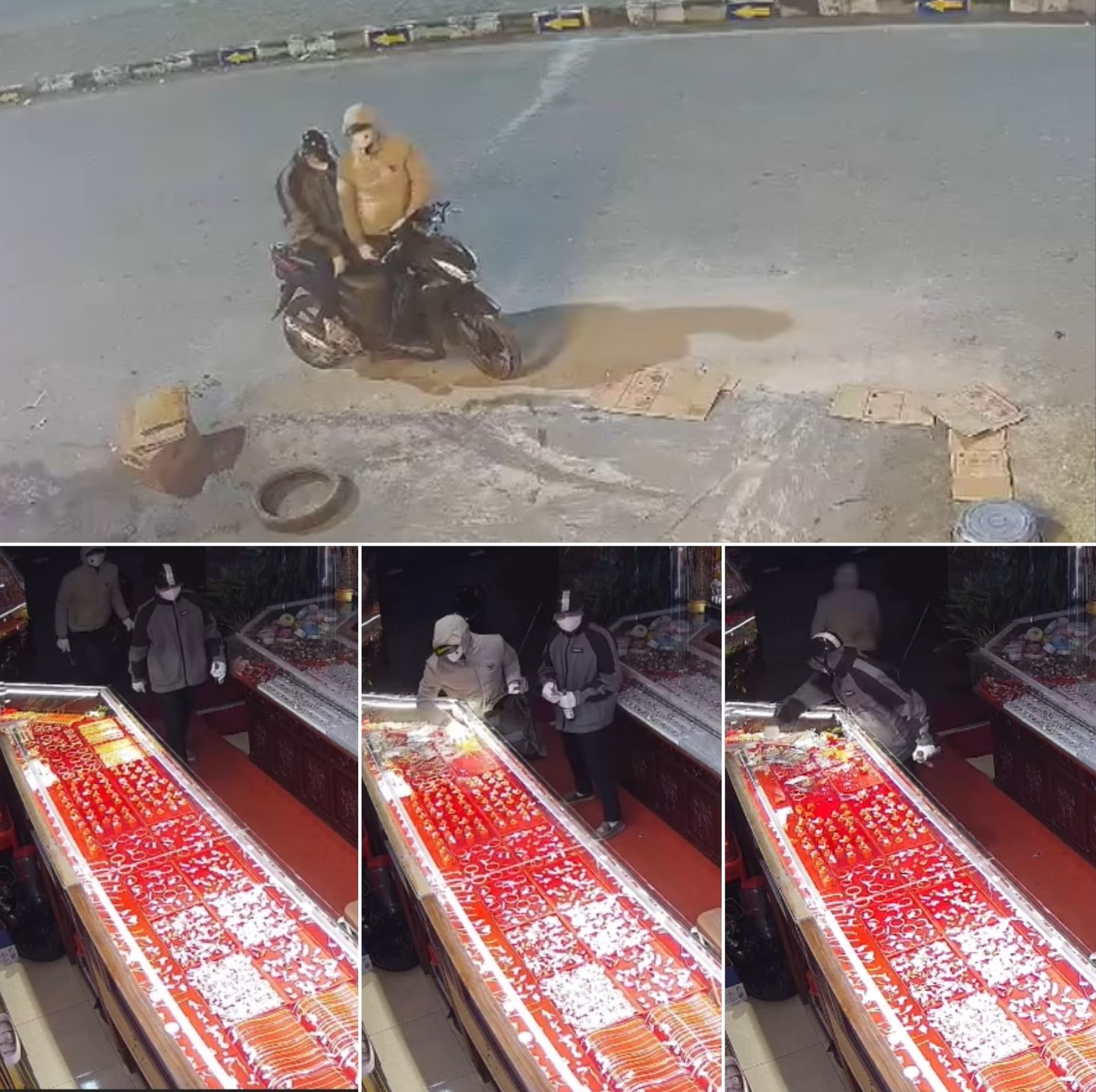 Hai người đi xe máy đeo khẩu trang kín mít,1 người đi trước mang theo…., 1 người đi sau cầm vật dụng vào tiệm vàng phá tủ rồi vơ liên tục cho vào balo vào đêm qua