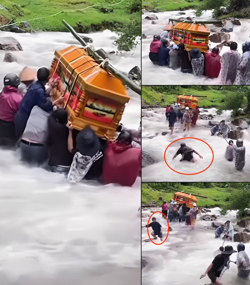 Cơn mưa lớn kéo dài nhiều ngày khiến các con suối dâng cao, đường xá bị chia cắt, cây cầu gỗ duy nhất nối hai thôn bị cuốn trôi. Thế nhưng tang lễ không thể hoãn, người mất vẫn cần được an táng, và thế là hàng chục người dân – bất chấp nước lạnh, xiết mạnh – cùng nhau vượt dòng suối để tiễn đưa người quá cố về nơi an nghỉ cuối cùng.