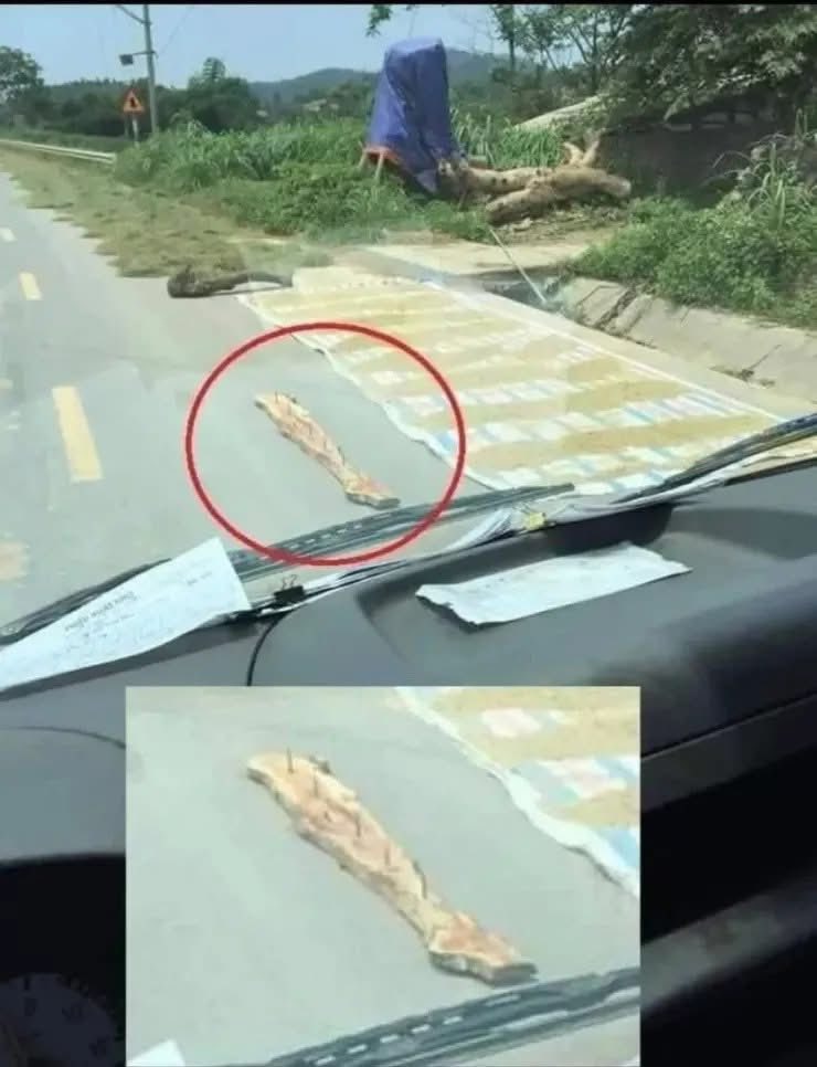 Nhiều người phơi lúa ngoài đường còn dùng tấm gỗ gắn đinh gây nguy hiểm cho người tham gia giao thông. Ảnh minh họa: T.NHUNG