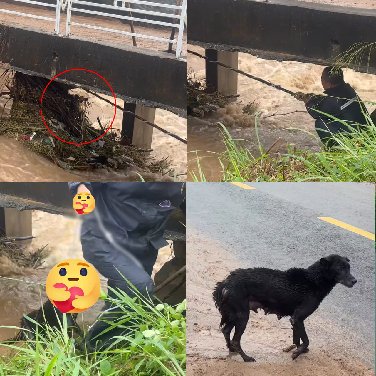Thế nhưng, ông chú – người đàn ông trung niên sống gần đó – đã không do dự. Ông lội xuống, lần từng bước trên nền đất ngập sâu, rồi ngồi thụp xuống giữ chắc vào trụ cầu để khỏi bị nước đẩy ngã. Ông kiên nhẫn chìa tay, gọi nhỏ để chó mẹ không hoảng sợ. Và rồi khoảnh khắc khiến mọi người vỡ òa: chú chó mẹ thòng vào sợi dây trên cây sào, rồi được kéo vào bờ an toàn